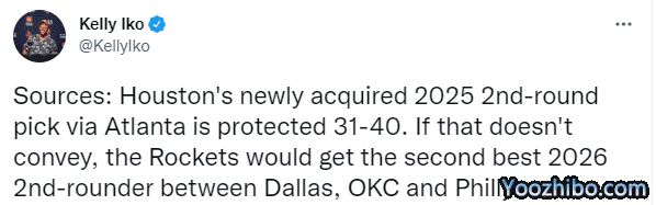 据火箭记者Kelly Iko报道,火箭得到的是2025年31-40顺位受保护二轮秀,若不能得到这样的二轮秀,火箭将会得到一个2026年二轮秀(来自独行侠、雷霆或者费城76人),这笔交易达成的关键就是这个选秀权。